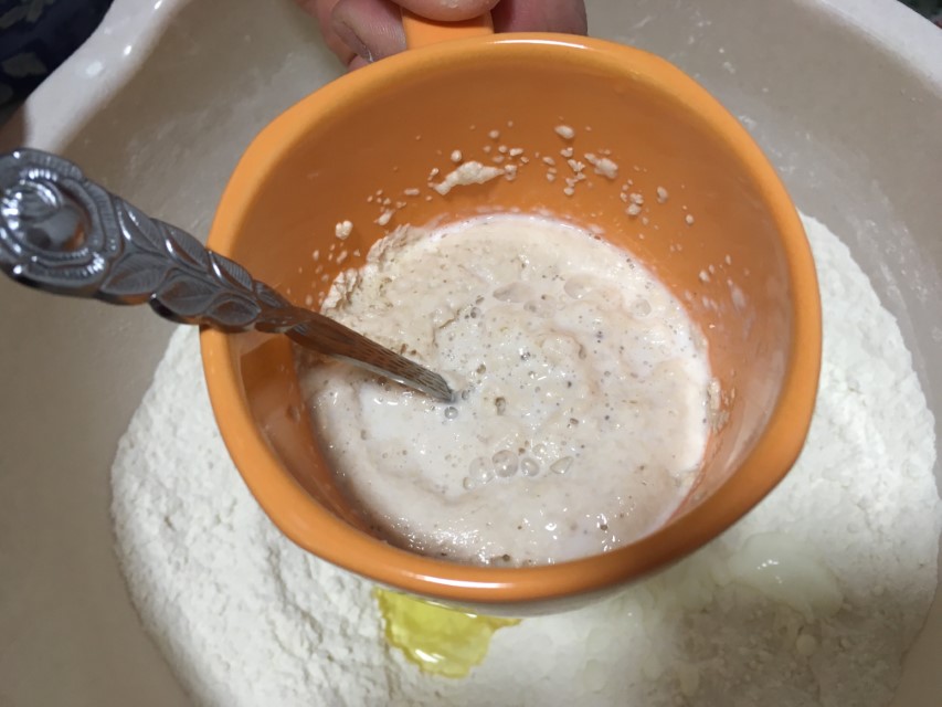 - Umplem pe jumatate o cana cu apa putin calduta si punem drojdia cu 1 lingurita zahar sa creasca. Nu respect instructiunile de pe pachetul de drojdie pentru ca daca am pus drojdia direct in faina am vazut ca nu creste frumos aluatul. Pentru 1 kg faina este suficient un pliculet de drojdie (lucru constatat din experienta).