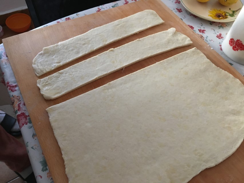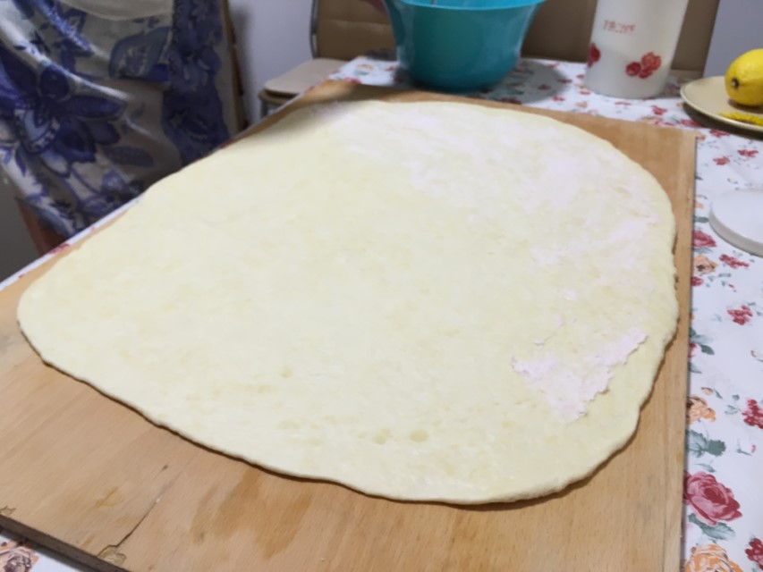 - Intindem coca cat putem de bine si o acoperim cu 1/3 din osanza amestecata cu faina cu ajutorul unui cutit mai bont, pe care o intindem pe toata suprafata pana o terminam pe toată (1/3).