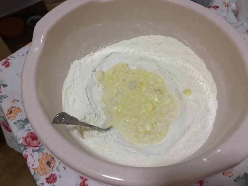 - Punem faina intr-un castronel, facem o gaura in mijloc si punem: ouale intregi, smantana, restul de zahar, sarea si adaugam drojdia, dupa ce a crescut.
