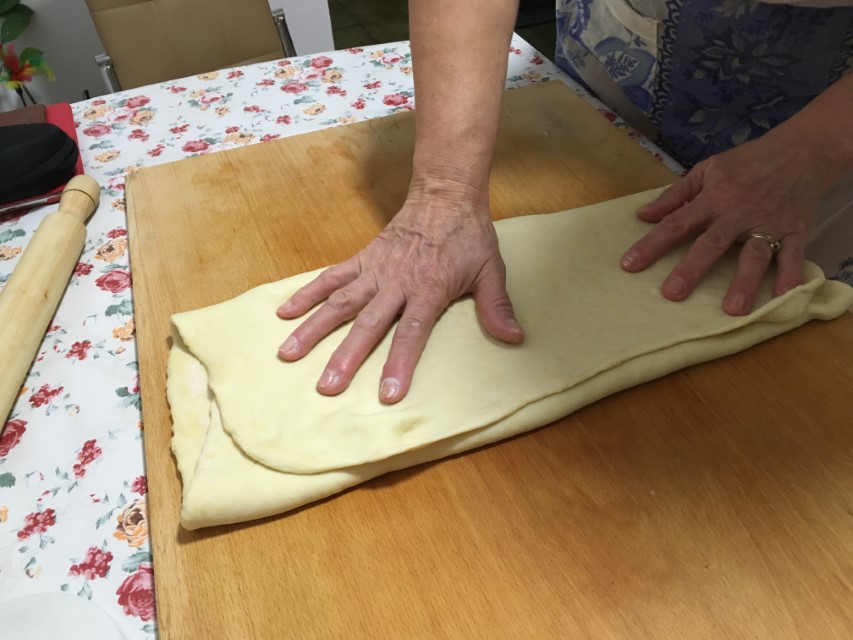 - Acum incepem sa impaturim foaia de aluat in trei, de la stanga la dreapta si apoi de jos in sus, asa cum vedeti in imagine.