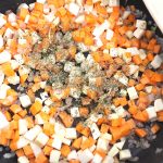 Când aceasta devine translucidă, adăugăm și morcovul împreună cu pătrunjelul și țelina. Opțional, pentru mai multă savoare, adăugăm o lingură de bază de mâncare din ardei kapia, ½ linguriță de măghiran și tot atâta tarhon.