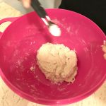 Frământăm aluatul timp de 10 minute, până nu mai este deloc lipicios și devine elastic. Eu am adăugat și puțin ulei de măsline la început fiindcă altfel mi se lipea de mâini. După ce terminăm de frământat îl lăsăm la dospit pentru 45 de minute.